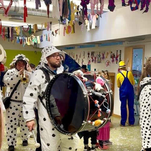 Später besuchten uns die örtlichen Vereine und sorgten für weitere närrische Höhepunkte. Frau Brettschneider hielt eine unterhaltsame Rede und ließ dabei auf humorvolle Weise lustige Begebenheiten aus dem vergangenen Jahr Revue passieren. Ein ganz besonderer Moment war die traditionelle „Befreiung“ der Schüler*innen durch die Landfrauen, begleitet von schwungvoller Musik des Musikvereins. Gemeinsam wurde noch einmal gesungen, geschunkelt und geklatscht.