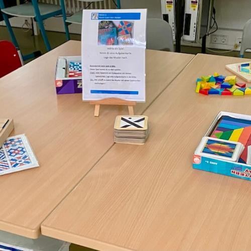 Die mobile Mathe-Werkstatt stellt das Schulamt Lörrach zur Verfügung. In zwei großen „Schatz“-Kisten befinden sich 15 Stationen, die alle einen engen Bezug zum Bildungsplan der Grundschule aufweisen und an denen die SchülerInnen mit Kopf, Herz und Hand mathematische Inhalte neu entdecken. Für vier Wochen pro Schuljahr leihen wir uns die Mathe-Werkstatt aus und die Kinder werden in dieser Zeit zu Mathematikforschern. Sie legen Muster und Figuren, spiegeln Flächen, finden Wege, bauen Brücken und Gebäude, lösen Zahlenquadrate und lassen sich von vielen Ideen aus der Mathematik begeistern.